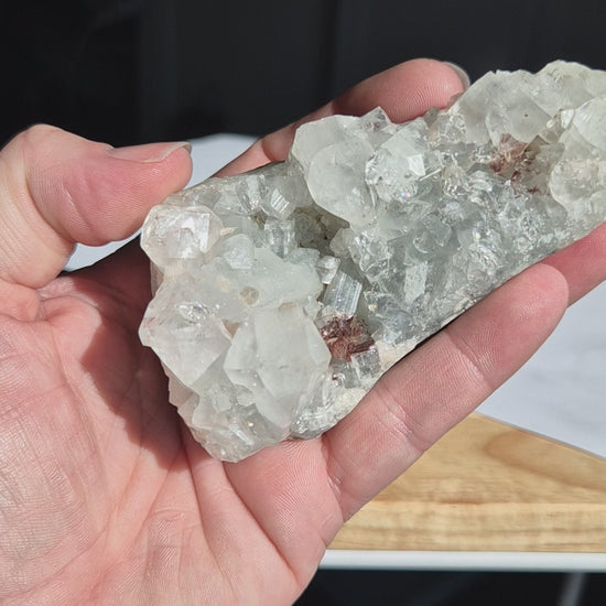Apophyllite is a stunning, high-vibration mineral that often forms in delicate, prismatic clusters with a glassy to pearly lustre. Despite being referred to as a single mineral, "Apophyllite" is actually a group of minerals within the Phyllosilicate class, most commonly including Fluorapophyllite (KCa4Si8O20(F,OH)·8H2O) and Hydroxyapophyllite. These crystals are typically colourless or white but can also be found in shades of green, pink, yellow, and even blue. Their high water content and perfect cleavage give them a distinctive sparkle and clarity, making them popular among collectors and energy workers alike.