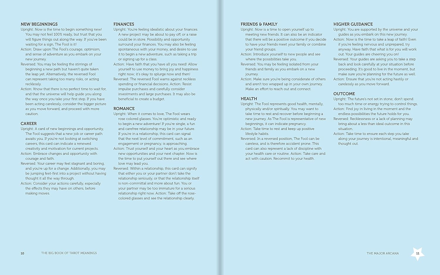 - Meanings for all 78 cards of the Major and Minor Arcana, with the various interpretations for each card organized into eight categories—Beginnings, Career, Money, Love, Friends & Family, Health, Higher Guidance, and Outcome—both upright and reversed